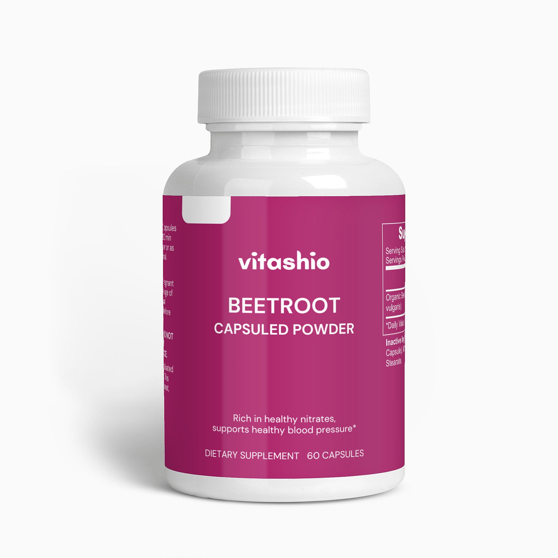 Ingredients: Organic Beetroot Powder (beta vulgaris), Cellulose (Vegetable Capsule), Microcrystalline Cellulose, Magnesium Stearate.